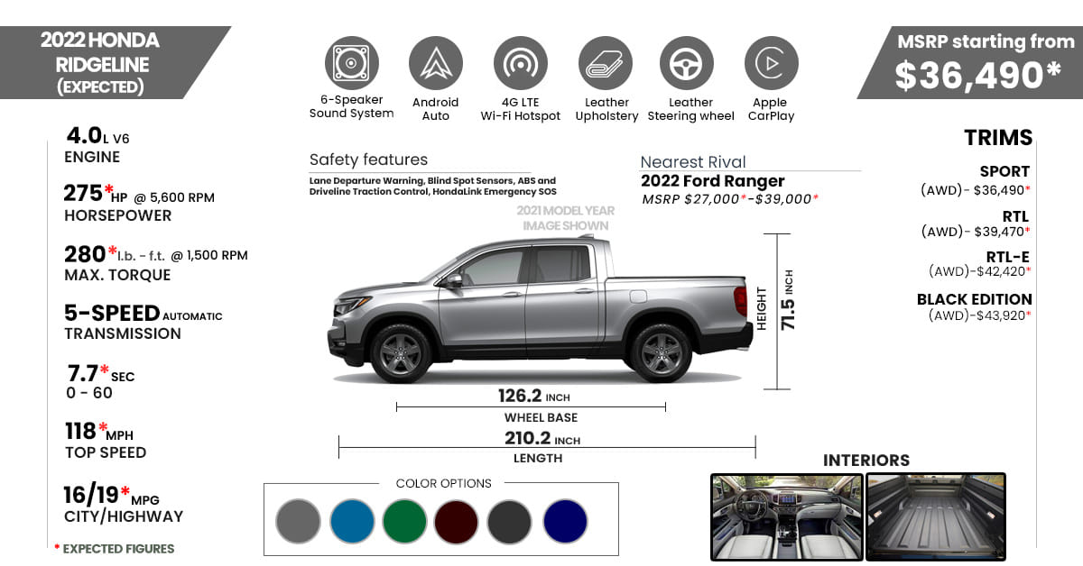 With the MotorTrend Fair Market Price powered by IntelliChoice get a better idea of what you. Natural Resources Canada Fuel Consumption Ratings date February 2021. The upcoming 2022 Honda Ridgeline will continue to deploy a standard FWD system.
